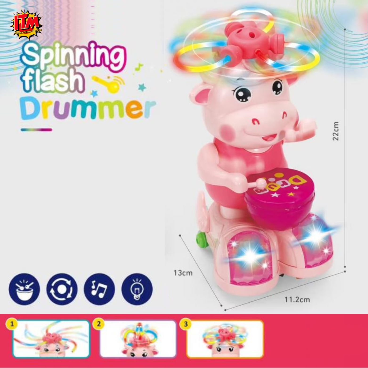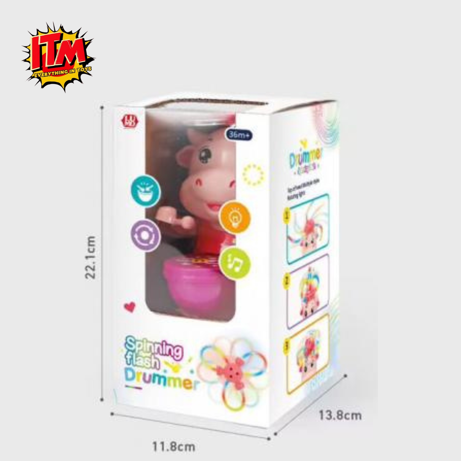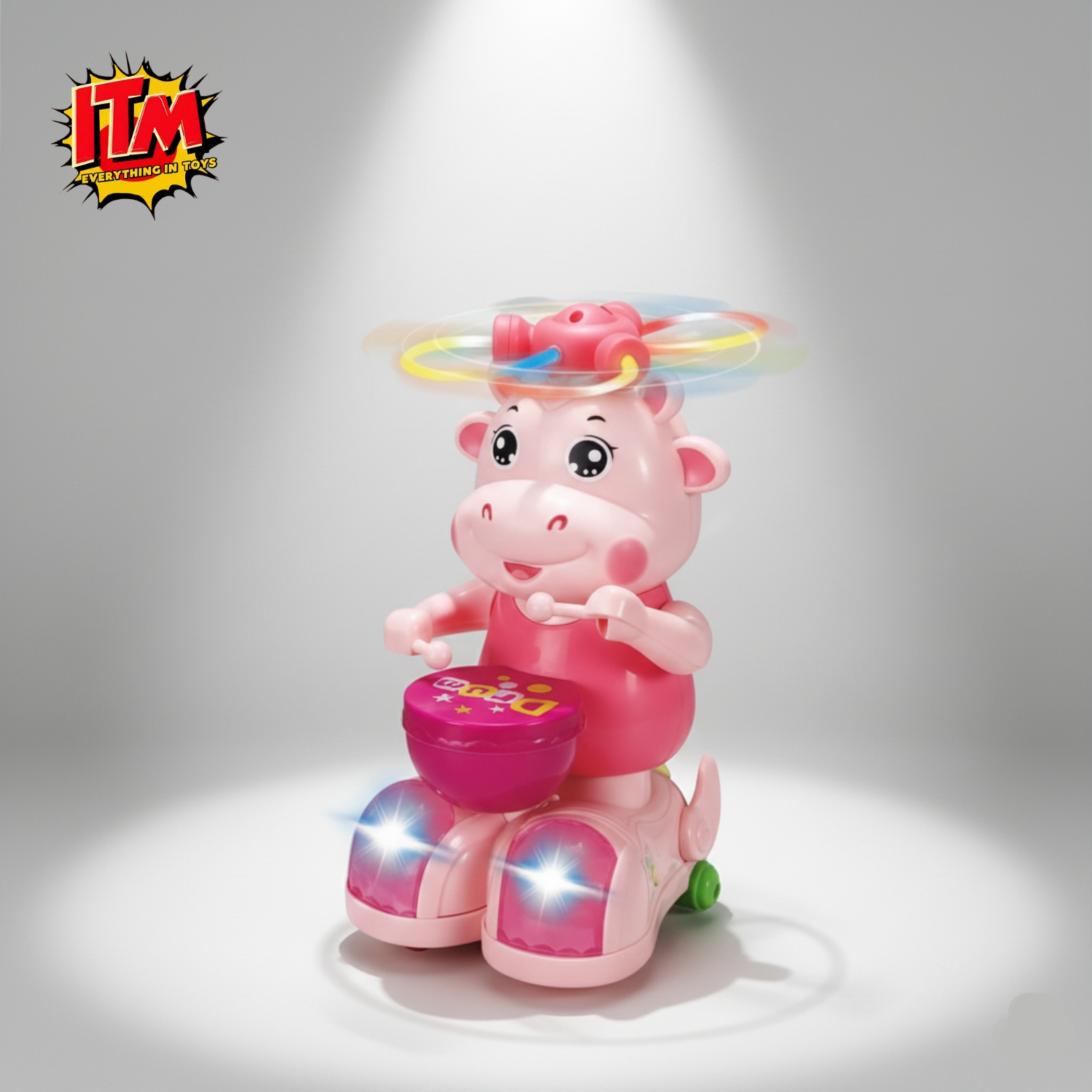 Bring a splash of fun and music to playtime with the India Toys Mart Spinning Flash Drummer! This adorable pink hippopotamus is more than just a toy—it’s an interactive experience. As it rolls along, its vibrant drumbeat and dazzling spinning propeller create an exciting light and sound show. The toy features cheerful music, flashing lights on its wheels and drum, and a fun bump-and-go action that changes its direction when it encounters an obstacle.