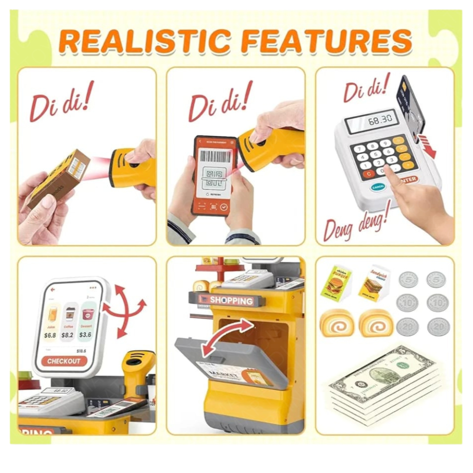 Designed for interactive play, this set includes a toy scanner and a variety of pretend food items, encouraging kids to role-play and learn. The convenient shopping cart and checkout counter are easy for little hands to manage, and the entire set is battery operated for continuous fun.